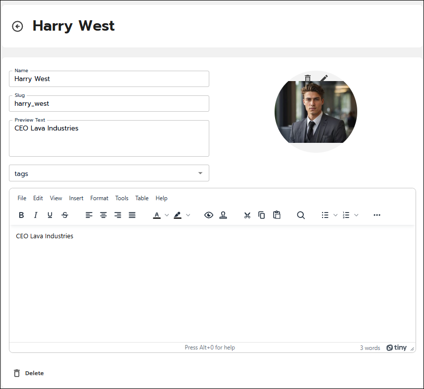 Preview text: Enter a short description (character limit of 78). This will display underneath the speaker photo when displayed in a grid.