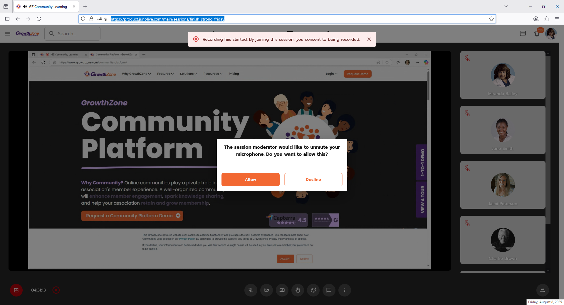 The participant receives a notification letting them know, "The session moderator would like to unmute your microphone. Do you want to allow this?"