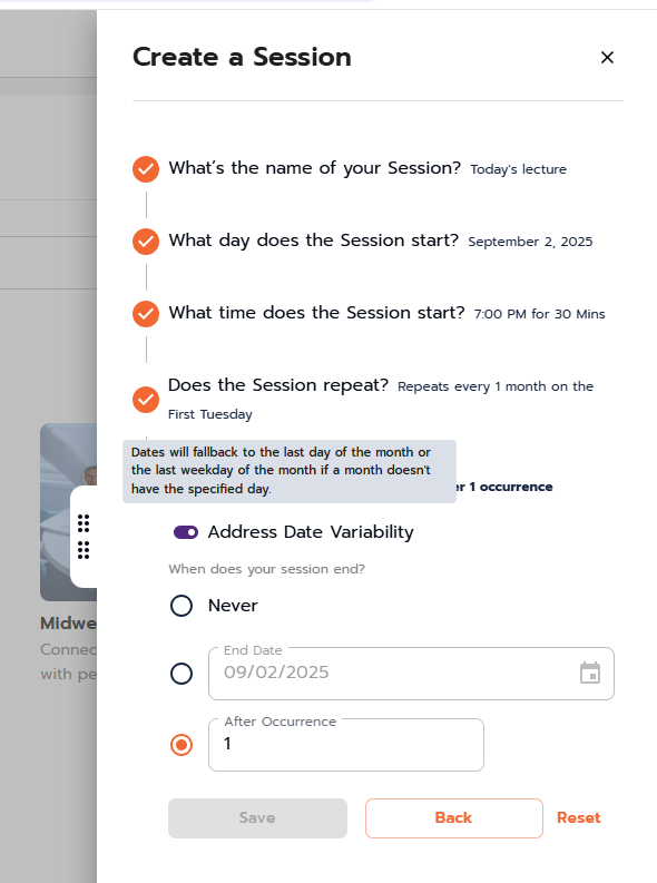 - Choose if this session repeats along with the desired cadence.