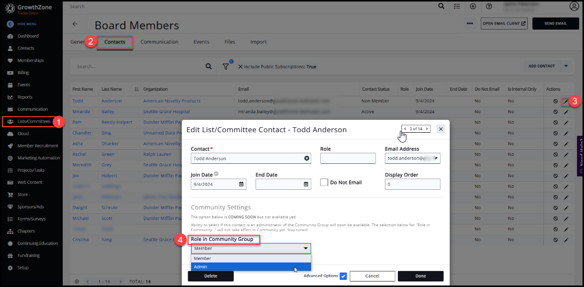 - The setting is titled 'Role in Community Group' within the 'Edit List/Committee Contact - [name]' popup.