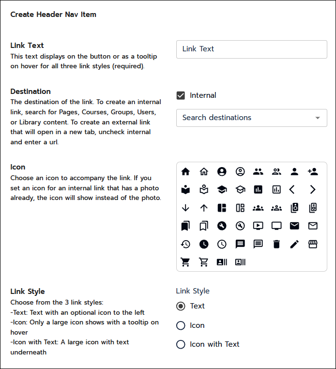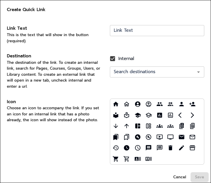- Icon: Choose an icon to accompany the link. If you set an icon for an internal link that has a photo already, the icon will show instead of the photo.