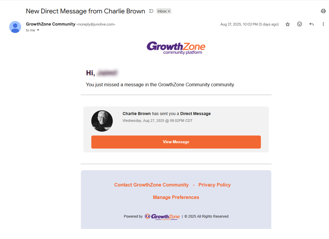 Direct Message Notification introduces real-time notifications (email and/or in-app) for direct messages within the Community Platform to improve user responsiveness, increase engagement, and enhance retention. This feature is also included in the Daily Digest. Please see the Daily Digest Email Notification article for more information.